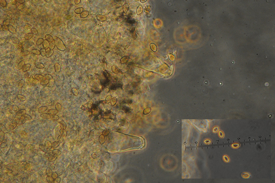 Pleurocystidia precent, with crystals at apex. Sp. 8 my.
